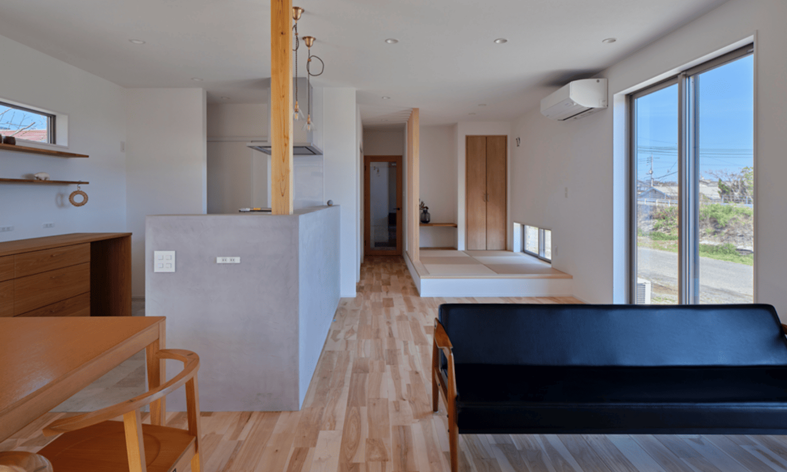 コの字型の平屋は、外からの視線をゆるやかに遮りながらも、内側にはしっかりと光と自然を取り込みます。季節のうつろいを感じながら過ごす暮らしは、心にもゆとりをもたらしてくれます。どこにいても自然を身近に感じられる設計は、平屋ならではの贅沢です。
