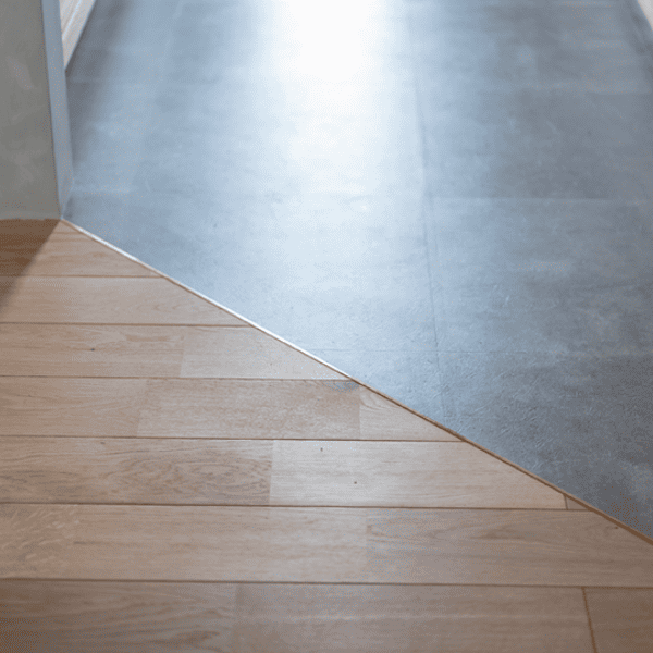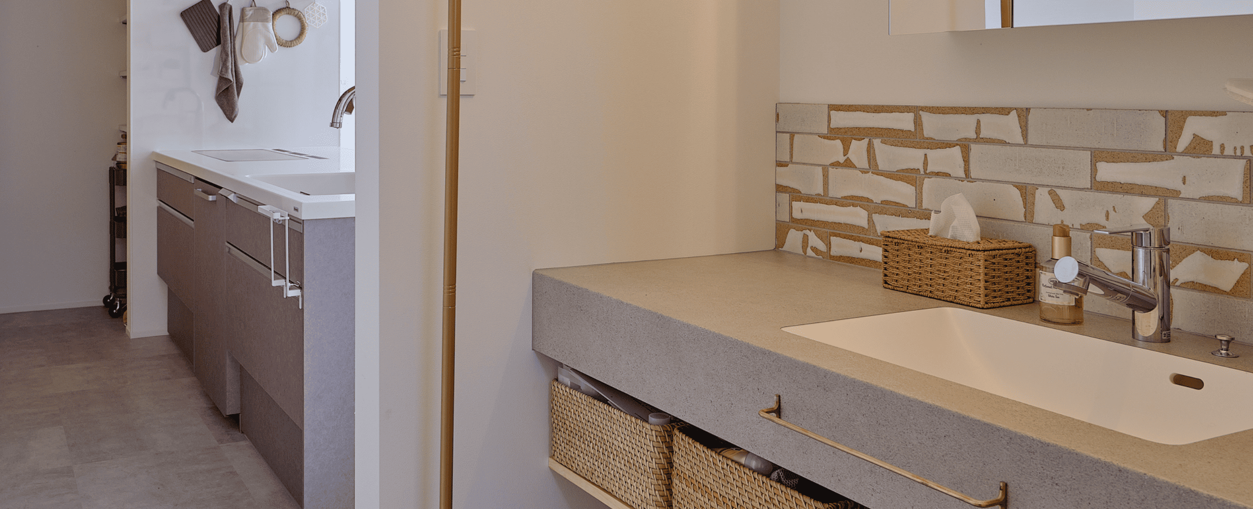 真鍮の見切り材は使うほどに味わいが増し、素材の美しさで空間を引き締めます。