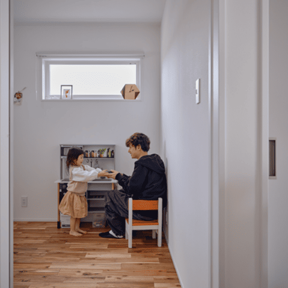 壁や階段に隔てられない、ワンフロアの平屋だからこそ生まれるのが、自然とつながる家族の距離感です。リビングからキッチン、寝室や子ども部屋まで、どこにいてもやさしく気配が伝わる設計です。離れすぎず、干渉しすぎることもありません。そのちょうど良い距離感が、家族の安心感や心のゆとりにつながります。ふと目が合ったり、声が届いたり、そんな日常のひとコマが、穏やかであたたかい暮らしを育んでいきます。